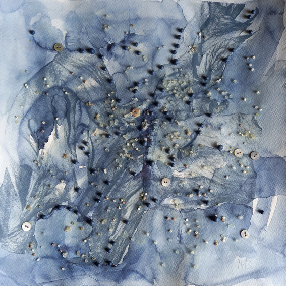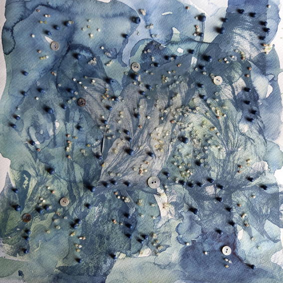 WASSER-REICH_02, Siebdruck, Aquarell, Perlmuttknöpfe, Holz- und Glasperlen, 30x30cm