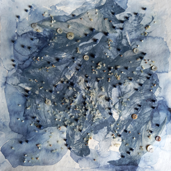 WASSER-REICH_03, Siebdruck, Aquarell, Perlmuttknöpfe, Holz- und Glasperlen, 30x30cm